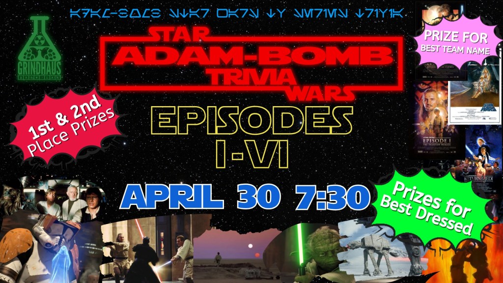 Grab your lightsaber, climb into your X-Wing and make your way to Grindhaus (in less than 12 parsecs) at 7:30pm on April 30th, 2026 for an evening of trivia of the first 6 Star Wars movies! From obscure to questions everyone knows. It’s an Imperial Grab-Bag!